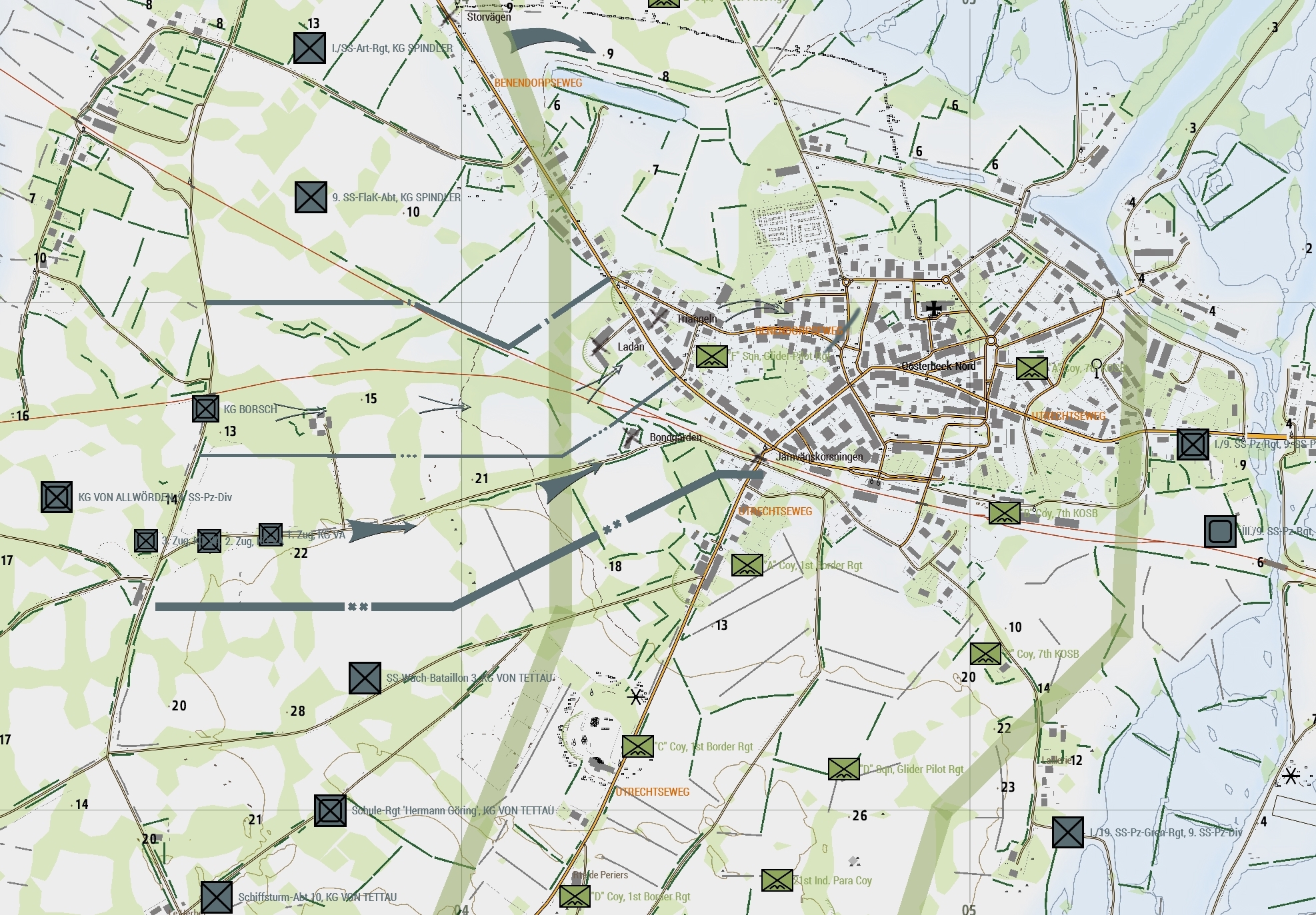 9. SS-Panzer-Division ‘Hohenstaufen’ ansvarar för den norra och östra delen av fickan. En bataljonsstridsgrupp från 9. SS-Pz-Rgt anfaller österifrån understödda av stridsvagnar i syfte att ta stadskärnan. Kampfgruppe SPINDLER anfaller till vänster om oss i syfte ta terrängen norr om OOSTERBEEK. Ett kompani ur KG SPINDLER utgör vår reserv.
